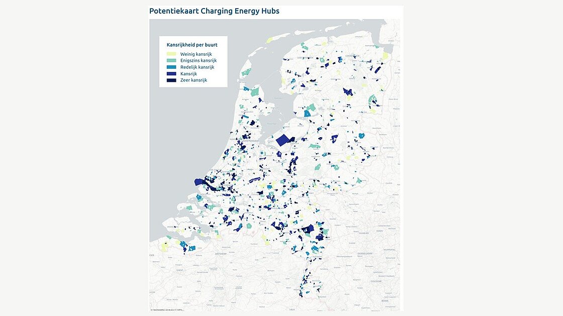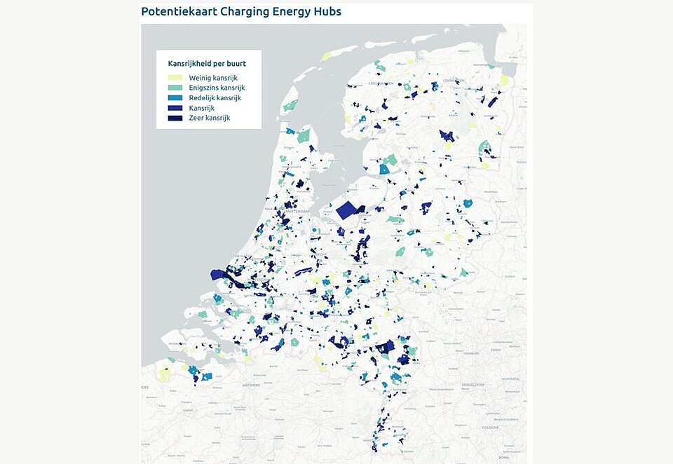 De ruimtelijke analyse in het rapport laat zien dat er rond de 500 kansrijke locaties zijn voor Charging Energy Hubs. Kansrijke locaties bevinden zich met name op en rond bedrijventerreinen aan de randen van stedelijke gebieden, nabij hoofdtransportcorridors en grootschalige zon- en wind-opwek. Op deze locaties vallen logistieke schaal, ruimte en energiepotentie samen, wat de voorwaarden schept voor slimme laadoplossingen.