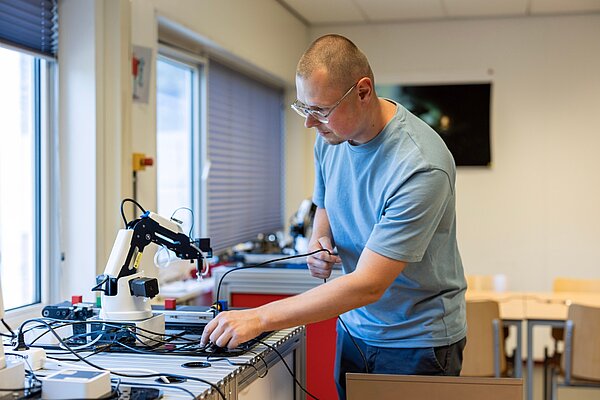 Dennis is nog even bezig. Toblerone-repen liggen op de tafels in het praktijklokaal. Dennis lacht. ‘Opdracht voor de studenten’, zegt hij. ‘Ze gaan een tool maken voor op een robotarm om de repen van A naar B te kunnen vervoeren. Écht mooi om te zien hoe verschillend de groepjes zo’n opdracht aanvliegen. Mijn rol? Kijken, vragen beantwoorden en ze af en toe op het goede spoor zetten. Super mooi, hoor.’