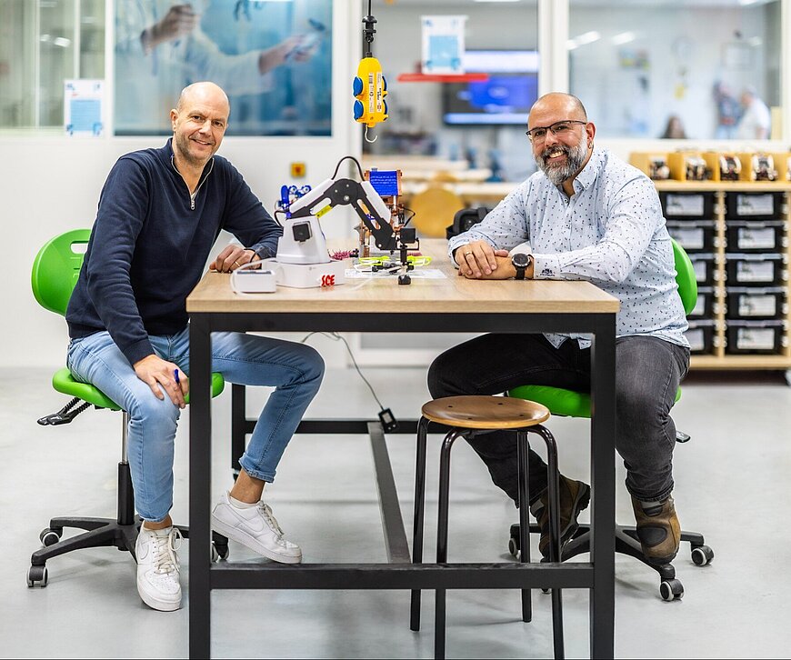 Joey: ‘Ik opende de deur meteen wagenwijd. Als technasdocent vind ik het heel belangrijk om een brug te bouwen tussen onderwijs en bedrijfsleven. Dat miste ik vroeger als leerling. Het is zelfs een belangrijke reden geweest om docent te worden. Die koppeling met het bedrijfsleven maken we op het Stedelijk College Eindhoven op verschillende manieren, maar van deze – hybride docentschap – word ik héél enthousiast. Dankzij Rody wordt techniek veel breder dan wat er in het lesboek staat. Hij geeft niet één keer een gastles, maar brengt structureel, namelijk iedere week, twee werelden samen. Zo vertrouwen leerlingen hem en kunnen we samen lessen ontwikkelen. Ondertussen spijker ik mijn kennis bij en heb ik mijn handen vrij om leerlingen nóg beter te helpen. Het mes snijdt aan veel kanten.’