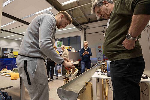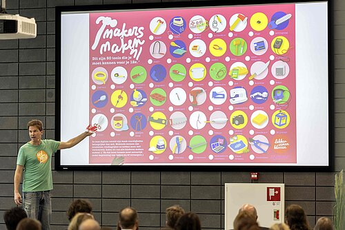 Bij zo’n beetje iedere participant op het beleefplein of de inspiratiemarkt en bij iedere workshop wordt wel duidelijk: technologie zit in iedereen, je hoeft er geen wiskundeknobbel voor te hebben. Ook Rolf Hut, expert op het gebied van maakonderwijs, benadrukt dat. Hij begint en sluit het Kennisfestival af met zijn keynote, waarin hij het belang van samen problemen oplossen en het omarmen van de eigen wereld van leerlingen benadrukt. ‘Niet het oefenen van een wiskundige formule, maar het samen creëren blijft leerlingen bij. Laat traditionele kaders los en geef leerlingen de vrijheid, het vertrouwen en het gereedschap om de wereld te veranderen.’ Daar kan bezoeker Bart Habraken, wiskundedocent aan het Eckartcollege, zich volledig in vinden. ‘Door leerlingen de ruimte te geven om zelf te ontdekken, leren ze op hun manier problemen op te lossen. Een vaardigheid die ze óók buiten school goed kunnen gebruiken. Dat neem ik dan ook, samen met alle andere inspiratie die ik vandaag heb opgedaan, mee naar mijn werk.’