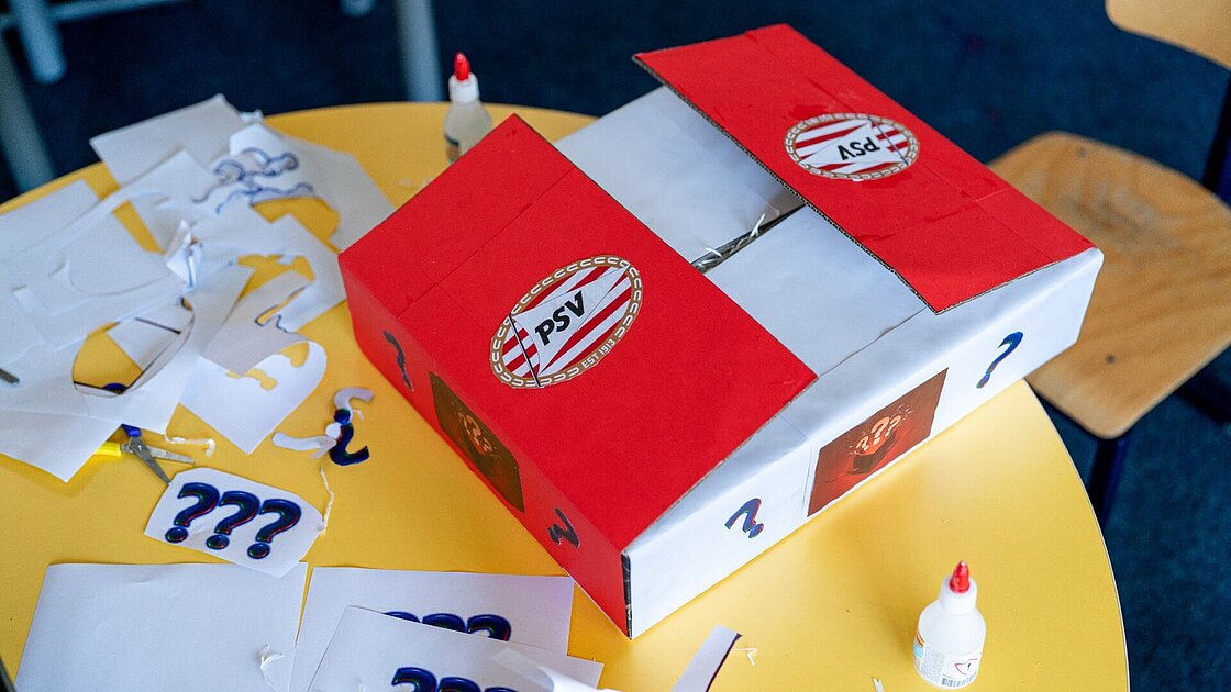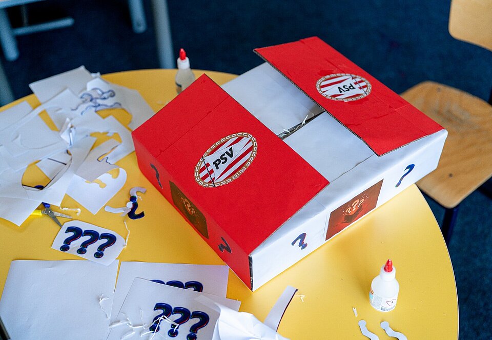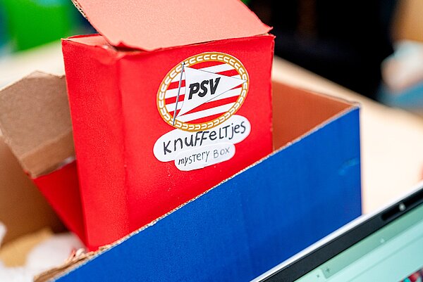 In het klaslokaal in Lieshout is het een levendige boel. Overal liggen schetsen, laptops staan open en leerlingen overleggen druk met elkaar. Aan een tafel werkt een groepje van vier leerlingen hard aan de challenge. Amy, Sanne, Lars en Stef hebben eerst flink gebrainstormd. Ideeën kwamen en gingen, tot één plan bleef hangen: een PSV Mystery Box. ‘Dat maakt het juist leuk’, zegt Stef. ‘Je koopt een doos, maar je weet niet precies wat erin zit. Het blijft een verrassing.’ In de doos kunnen verschillende PSV-gadgets zitten, zoals sleutelhangers, handdoeken of zelfs een shirt. De leerlingen bedachten zelfs twee varianten: een kleine en een grote box. ‘De kleine is goedkoper, en in de grote zitten meer spullen of iets wat meer waard is’, vult Sanne trots aan.