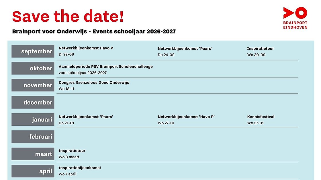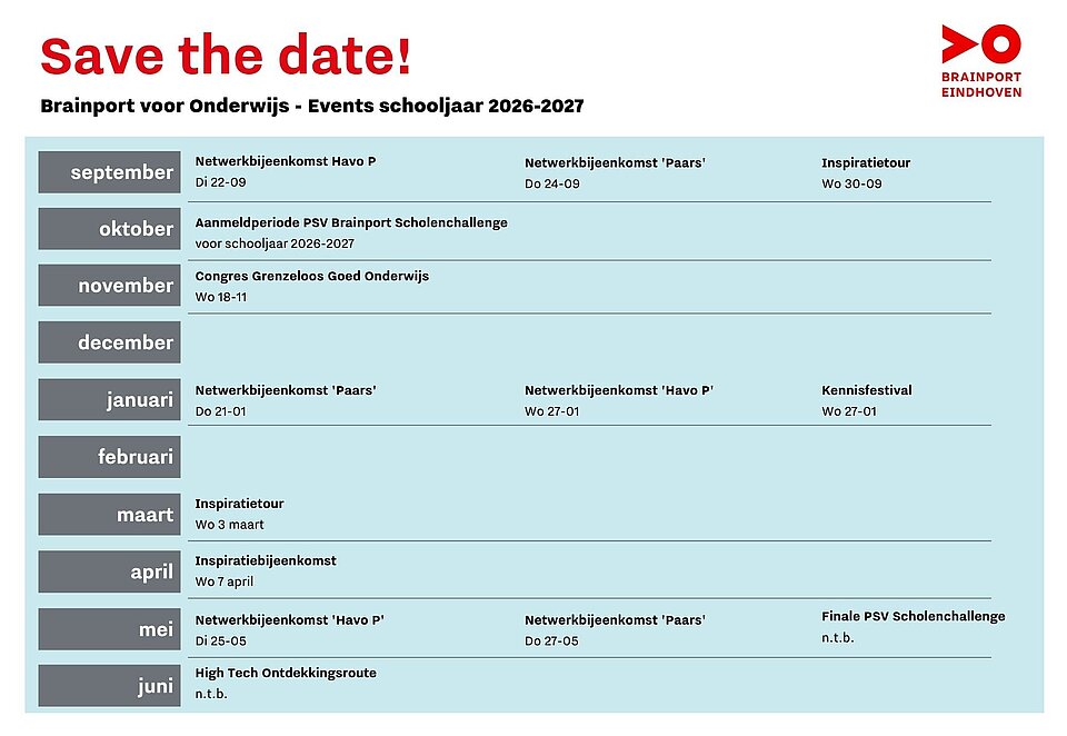 Hieronder vind je de Brainport eventkalender voor het schooljaar 2026–2027. Download de kalender via de button en houd alvast een plekje in je agenda. Zo blijf je op de hoogte van alle relevante events!