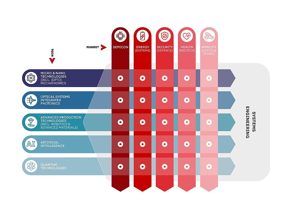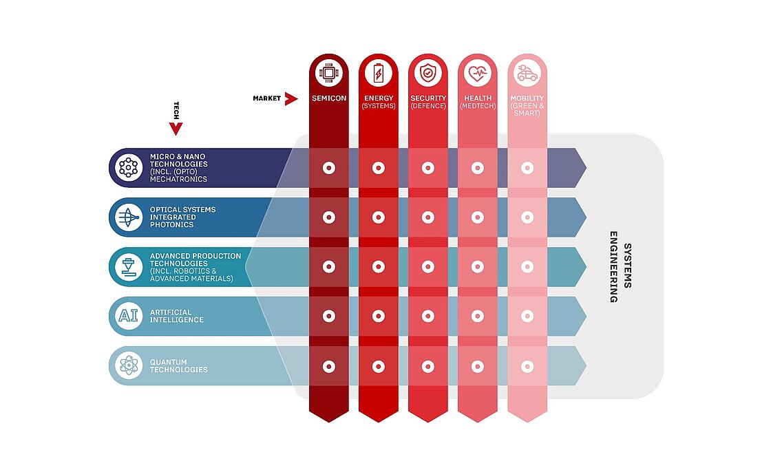 Kansrijke markten zijn naast semicon: fotonica, energie(systemen), defensie, ruimtevaart, medtech en slimme mobiliteit. Technologisch onderscheidend zijn we in micro- en nanotechnologie, systems engineering, geïntegreerde fotonica en geavanceerde productietechnologieën, met groeiende aandacht en kansen voor AI en quantumtechnologie. Dat heeft geleid tot onderstaande matrix van technologieën en markten waarop we ons richten.