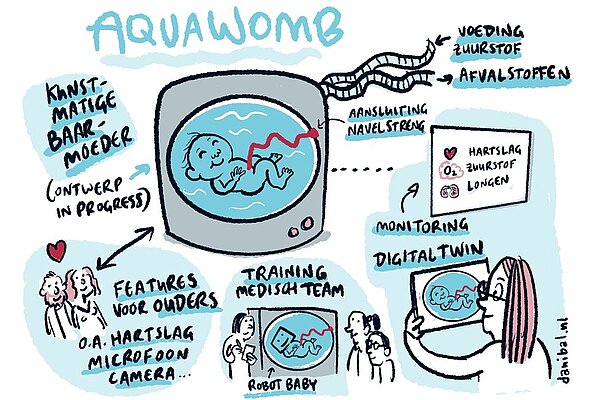 It is also important that the caregivers know how the baby is doing and that there is contact with the parents in order to be able to build a bond with their child right from birth. Myrthe van der Ven, researcher and CEO of AquaWomb, and Juliette van Haren, researcher and designer at the Department of Industrial Design, explain how this works in the video from the University of the Netherlands.