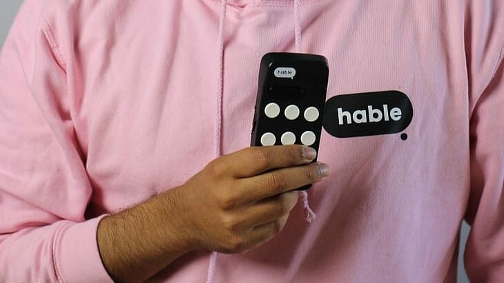 De Hable One is een klein en handzaam apparaatje waarmee blinde gebruikers makkelijk en snel braille kunnen typen op de smartphone.